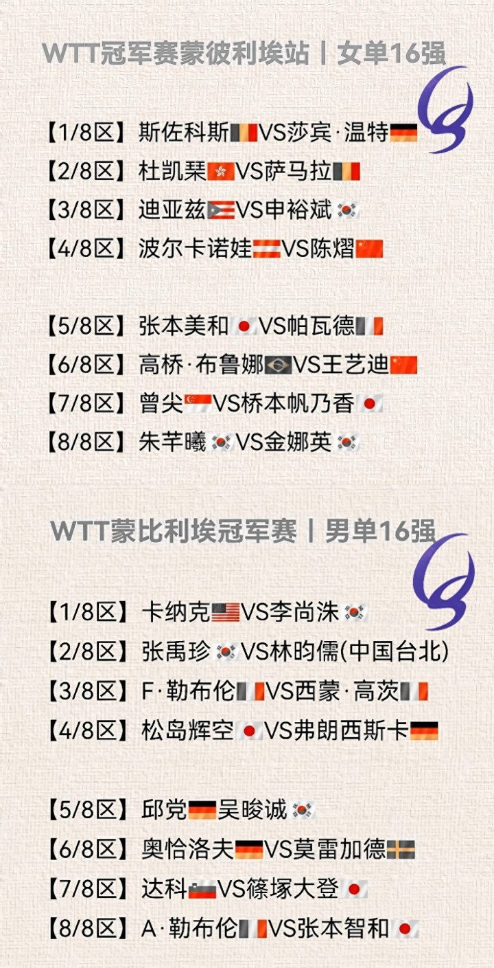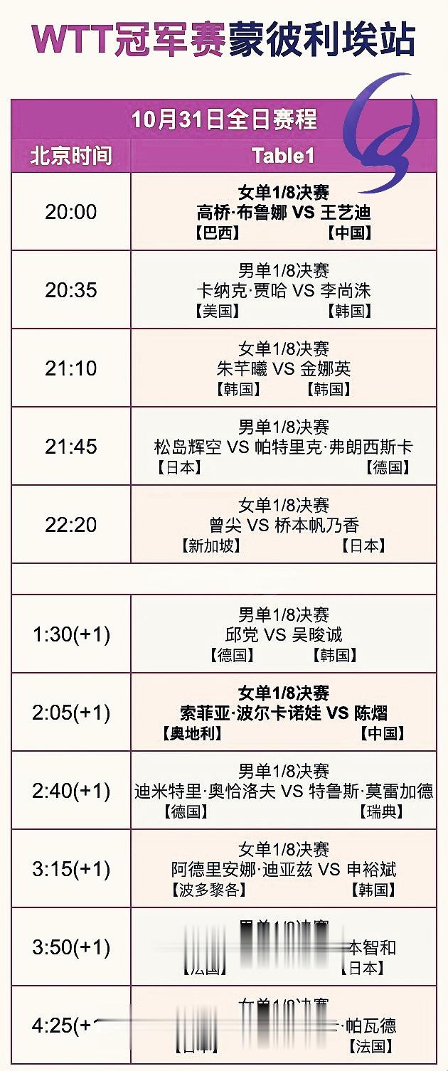 北京时间10月31日,WTT蒙彼利埃冠军赛进入1/8决赛阶段。根据赛程安排,今天全天24小时内有三个比赛时段,最终决出全部8强名额。